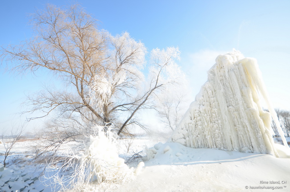 Popularly known as frost flowers or ice-rimmed trees, rime refers to frost attached to tree branches, different from snow or ice. It only appears in winter because very a low temperature is required. Also there should be abundant water vapors. Embraced by water on all sides, Rime Island enjoys an advantageous position, which is perfect for the formation of frost flowers. The water here does not freeze in winter, generating water vapors continuously. When blown by breeze, they fly to trees nearby and condense to form rime due to the dramatic drop of temperature. In winter, the oddly-shaped weeping willows along the river banks on Rime Island are dressed in pure white. From a distance, the frost flowers look like white clouds or waves. Visitors may feel they are in a fascinating crystal fairyland with jade trees and silver flowers.